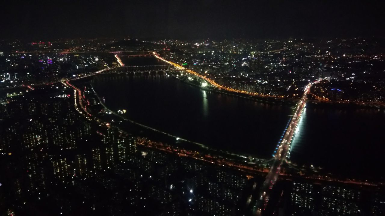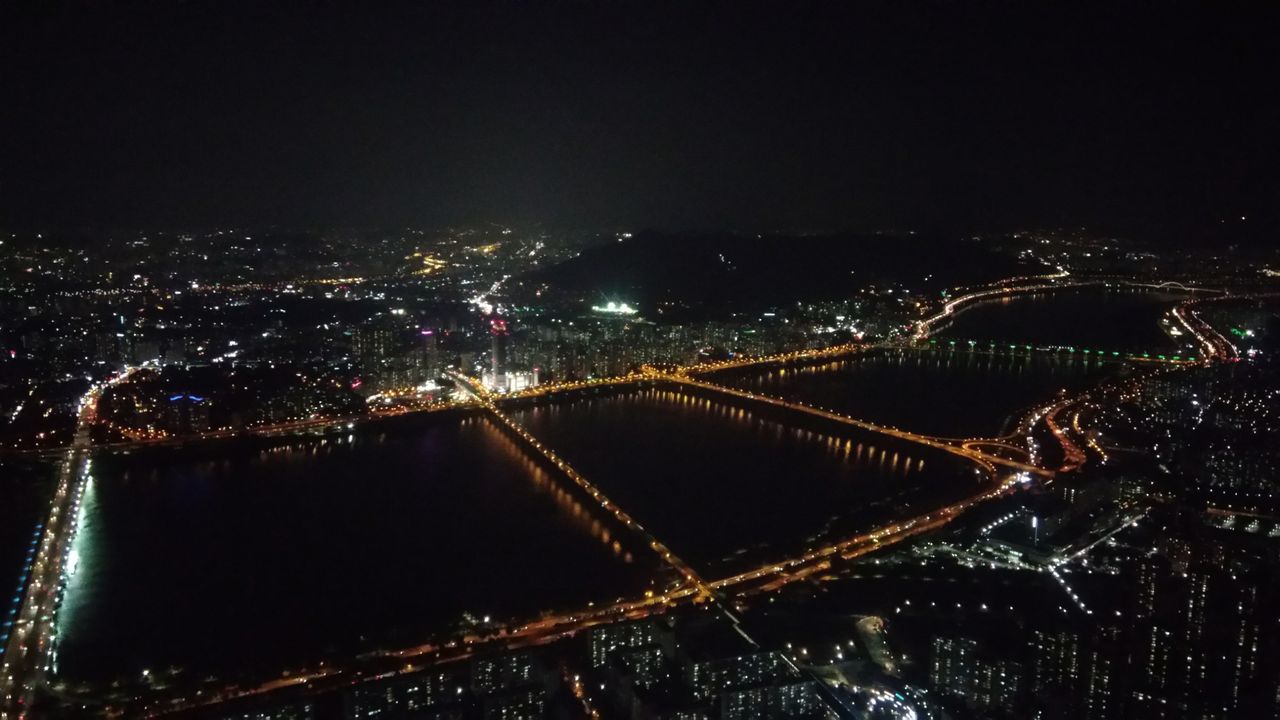 大都市が川で分断されてて、何本も橋がかかってライトアップされてる、みたいな。